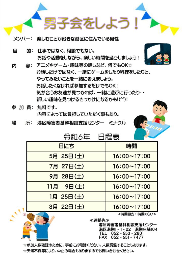 男子会を2ヶ月に1回(奇数月)行っています。ゲームやキャッチボール・映画鑑賞等…